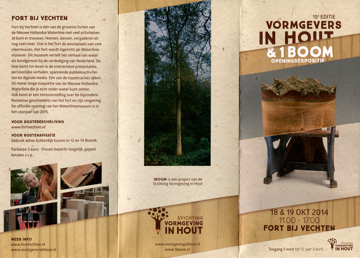 Op zaterdag 18 en zondag 19 oktober 2014 bent u van harte uitgenodigd voor de openingsexpositie van het ‘1Boom-project’ op het Fort bij Vechten. De 15de editie van de jaarlijkse houtexpositie Vormgevers in Hout staat dit jaar geheel in het teken van het 1Boom-project.