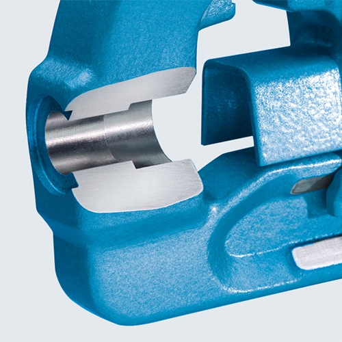 Door het mechanisch gesmede (slanke) geleiderailsysteem biedt hij een grote diepspanmogelijkheid. De ingebouwde solide dubbele prismageleiding ligt goed beschermd tegen beschadiging en vervuiling. De grote, vierzijdig nabewerkte geleiderail garandeert een constante precisie en een soepel lopende verplaatsing van de voorbek, zelfs bij het inspannen van kwetsbare werkstukken.