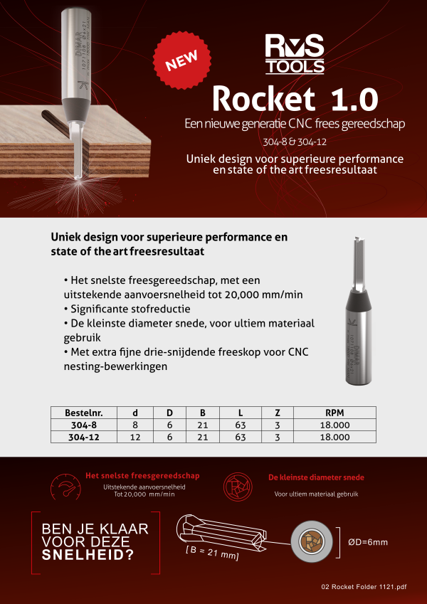 De Rocket 1.0 groeffrees voor CNC-machines combineert hoge snelheid met efficiënt materiaalgebruik. Met een aanvoersnelheid tot 20.000 mm per minuut werkt deze frees bijzonder snel en schoon.