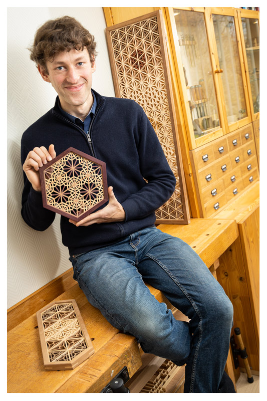 Verslingerd aan kumiko raakte Douwe na een bezoek aan Japan in 2018. "Ik hou niet van schroeven en spijkers. De mogelijkheid om alles weer uit elkaar te halen en opnieuw vorm te geven, dat is wat ik zo mooi vind aan kumiko." Er zijn diverse manieren om hout te verbinden zonder een spijker nodig te hebben. Een heel bekende verbinding is mitsu-kude, ofwel driewegverbinding. "Maar het is niet alleen de kumikotechniek die me zo trof in Japan. Ook de houtverbindingen in tempels vond ik heel interessant. En de manier van afwerken. Alles wordt, om maar eens wat te noemen, met schaven afgewerkt in plaats van met schuurpapier."