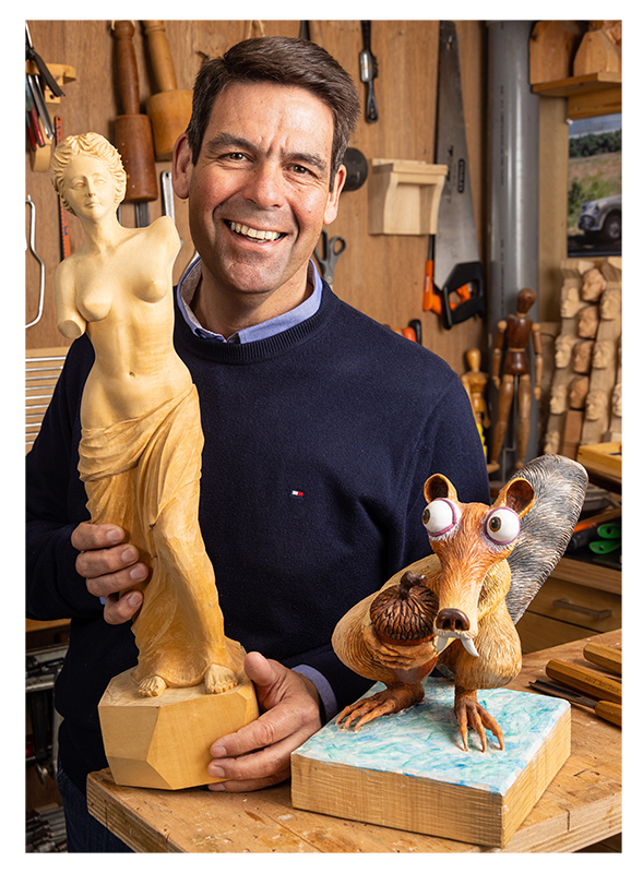 Van menselijke figuren tot dieren uit animatiefilms en van karikaturale koppen tot houten zwaarden. Dat laatste verdient wat uitleg. “In 2009 kwam ik zonder werk te zitten. In die periode kwam ik in contact met een tai chi-leraar die vroeg of ik houten zwaarden kon maken om mee te oefenen. Toen heb ik veel zwaarden gemaakt en verkocht, maar inmiddels doe ik dat niet meer. Zwaarden maken is meer machinaal werk en ik vind het houtsnijden echt het leukst. Hoe geef je iets vorm? Wanneer kloppen de anatomie en de verhoudingen?”