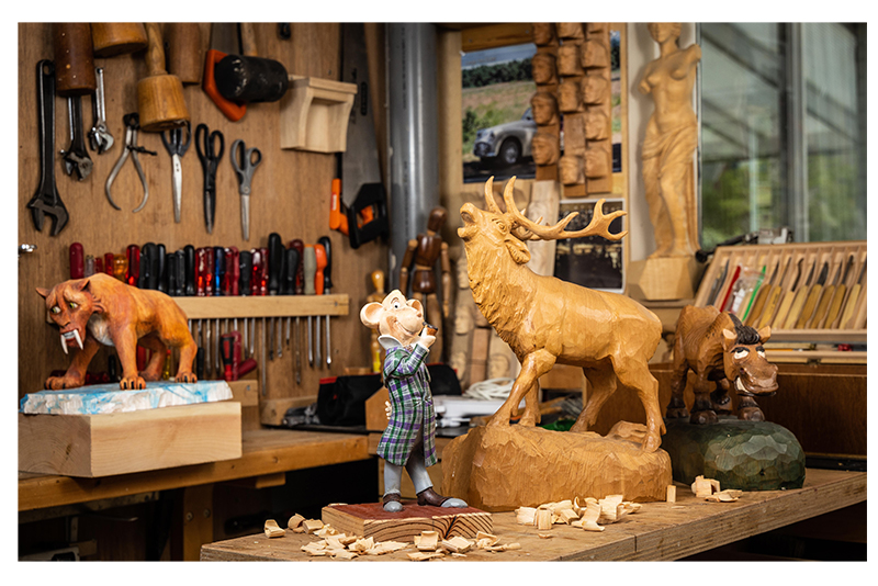 Tijdens een vakantieweek in Oostenrijk bloeide de liefde op. Tussen het houtsnijden en Gerard van Tuijl welteverstaan. Gerard ging samen met een vriend een week naar Schnitzschule (houtsnijschool, red.) Geisler Moroder in Elbigenalp en ontdekte toen hoe geweldig leuk houtsnijden is. “Die week in Oostenrijk was een week van bezinning en enthousiaste, leuke mensen”, vertelt Gerard met glimmende ogen. “Echt genieten. En er komt ook nog eens iets uit je handen.” Helaas overleed de vriend een jaar later, maar Gerard gaat nog steeds elk jaar naar Oostenrijk, nu met vriend Willem. Ieder jaar kiest hij vooraf een project om aan te werken. Dat kan de Venus van Milo zijn, maar ook een figuur uit de animatiefilm Ice Age. “Hiervan maak ik dan eerst een model, bestaand uit een stalen frame bekleed met was”, legt Gerard uit. Dit wassen beeld gaat mee naar Oostenrijk als voorbeeld, waar Gerard en zijn medestudenten onder professionele begeleiding een begin maken met het houten beeld. “Natuurlijk is het beeld niet in één week af, dus gaat het mee naar huis om verder aan te werken.” Gerard werkt graag met zirbenhout (alpenden, red.) vanwege de typische geur. “Hier ruik maar eens, ruik je dat? Zo lekker!”