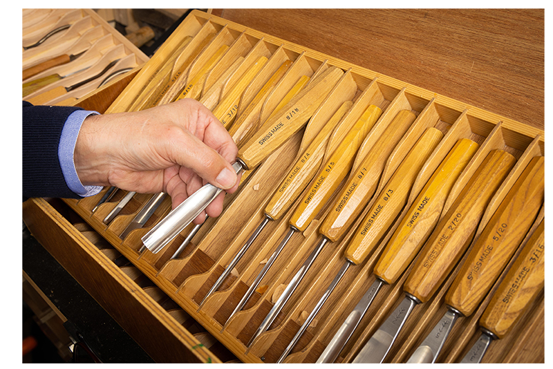 Voor elke fase van een houtsnijwerk gebruik je weer andere, dus het is onmogelijk een favoriet te kiezen. Daarnaast gebruik ik een passer voor het overbrengen van maten en verhoudingen van het wassen model naar het hout. En natuurlijk een fleshamer.” Gerard komt graag bij Baptist: “Al vanaf de jaren negentig, toen kocht ik daar mijn eerste beitels. Ik kom er nog steeds graag: je voelt je er welkom. Inmiddels heb ik al een aantal keer in de winkel demonstraties gegeven.”