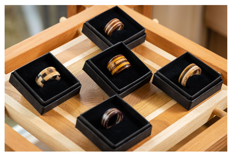 Het is vooral het hout zelf dat ze inspireert, vertellen ze. Er wordt dan ook niets weggegooid in de werkplaats van Studio Mooibos. Hans: “Kijk, hier heb ik een hele la vol reststukjes liggen.” “Juist die reststukjes geven ons inspiratie om kleine dingen te maken”, zegt Mariëlle. Dat werden onder andere houten ringen. Ze maken de ringen zelf, maar geven ook veel workshops. De voorbereiding is hier meer dan het halve werk: verschillende soorten hout worden eerst op de gewenste dikte gezaagd en vervolgens kruislings op elkaar verlijmd. Laagjes fineer ertussen zorgen voor een extra mooi lijnenspel. Uit deze gelaagde stukjes hout worden de ringen gemaakt. Voor het mooiste effect wordt er ook tropisch hout gebruikt, zoals wengé, padouk, zebrano of purperhart. Hans: “Inlands hout is qua kleur toch wat beperkter, gouden regen is dan een van de donkerste houtsoorten. Maar bijvoorbeeld taxus- of pruimenhout is wel echt prachtig!” Mariëlle: “Het mooiste is het als we stukjes overgebleven tropisch hout krijgen dat anders de kachel in gaat. Dat geeft een beter gevoel.” Het tropische hout wordt gecombineerd met inlands hout en soms met hout dat mensen zelf meenemen omdat het een speciale betekenis voor ze heeft.